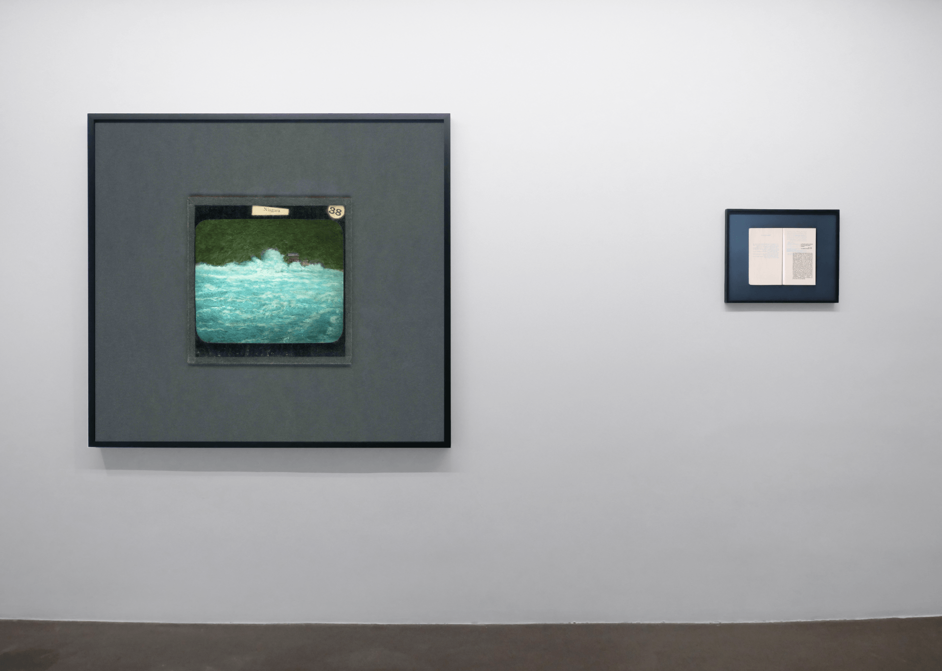 Sous le titre Les Chutes, Agnès Geoffray a fait de sa vision images : reproduction par captation, vues stéréoscopiques, plaques de verre d’anonymes du XIXème, gravures de maîtres anciens, photogravures de presse, couvertures de livre, et mises en scène avec femmes, main, papillon, yeux. La collecte de représentations anciennes, leurs captations, documentent des jeux de vide et de hauteurs, d’admiration et de fascination : silhouettes au bord du précipice à la manière des scènes de la nature d’un William Gilpin au XVIIIème siècle, ou contemplant à l’abri la trainée blanche écumante, funambule sur un filin ; jeux d’eau tumultueux qui courent vers le regard dont la bouillonnante coulée pourrait l’emporter, dans le lointain se cabrent juste avant que le fracas ne s’abatte sur de frêles habitations, combattent le sauvetage d’une femme sans connaissance, soutenue par le bras ferme d’un homme foulant les vagues. De clichés paysagers en clichés romantiques, un fil invisible se tisse. Air et eau se retrouvent dans les mises en scène de corps féminins et d’un environnement qui accuse leur solitude : femme au fond de l’eau, assise dans une blanche robe vaporeuse ; sur un promontoire, le bleu de la robe sculpté par le vent jouant avec les variétés lumineuses du ciel et de la mer. Entre des silhouettes seules ou par deux, et la localisation en profondeur ou en hauteur des héroïnes, vibre un corps disparu dans un nuage humide de molécules dû aux tonnes d’eau écroulées.