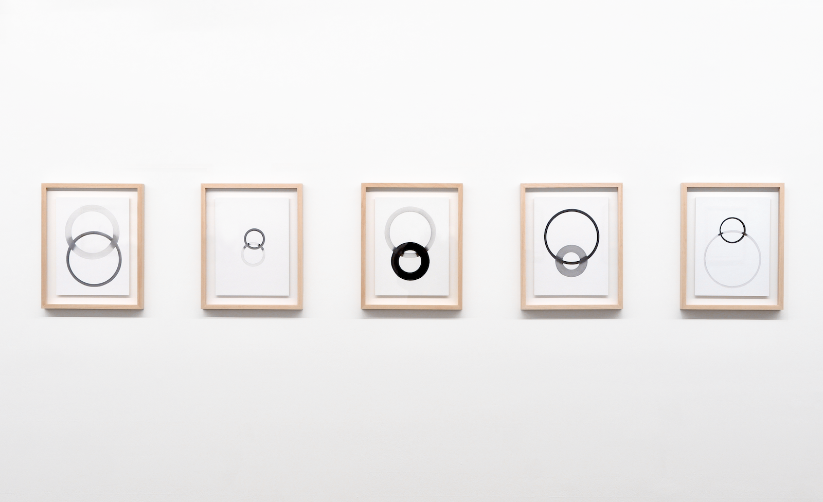 Le point de rupture dans l’œuvre de Lygia Clark est marqué par Caminhando (1963), une bande de papier découpée de façon à former un ruban de Möbius, cette surface continue et suggérant l’infini, dont on peut voir simultanément l’intérieur et l’extérieur. L’acte en constitue d’autant plus le cœur que les deux lignes (l’incision et ce qu’elle produit) sont assimilées, par le titre, à la marche, qui met en relation le corps en mouvement et l’espace traversé-découpé, la marche qui est ligne et, à ce titre, tient du dessin, comme l’écrit Tim Ingold dans Une brève histoire de lignes : « Le voyageur itinérant (wayfarer) est continuellement en mouvement. Il est, à strictement parler, son mouvement. […] l’itinérant se réalise dans le monde sous la forme d’une ligne qui voyage. » Les dessins réalisés par Gabrielle Conilh de Beyssac au moyen d’un tour de potier engagent singulièrement le mouvement : non seulement parce que la circularité régulière en est une forme symbolique, mais aussi parce que la feuille tourne et que la main bouge aussi, que les deux cercles font plus que suggérer un mouvement d’entraînement, l’encre se diffusant de l’un à l’autre à chaque passage (Cercles), qu’enfin les spirales s’éclaircissent à mesure que s’épuise la goutte d’encre qui sert à les former (Spirales), de même que les craies grasses s’amenuisent à déposer des traits sur le papier (Partitions). L’action est toujours réciproque et les deux parties en sont affectées – on entendra ce terme dans tout le spectre de sa polysémie.