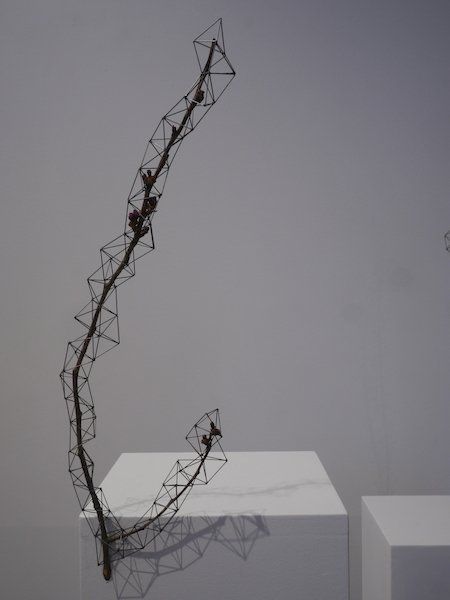 Devant cet Ikebana revisité, sur un socle, des fleurs séchées s’inscrivent dans des polyèdres aux allures de molécules faits de graphite. Au sous-sol et sous la terre cela pourrira et pullulera ou se disséminera. Dessous veillent Perséphone et Hadès en leur royaume où la mort n’existe que comme état transitoire vers la résurrection. Le travail d’Atsunobu Kohira, ici, nous entraine dans des circulations. Le carbone, deviendra-t-il diamant ou charbon, choisira-t-il fragilité et compacité entre tous les possibles ?